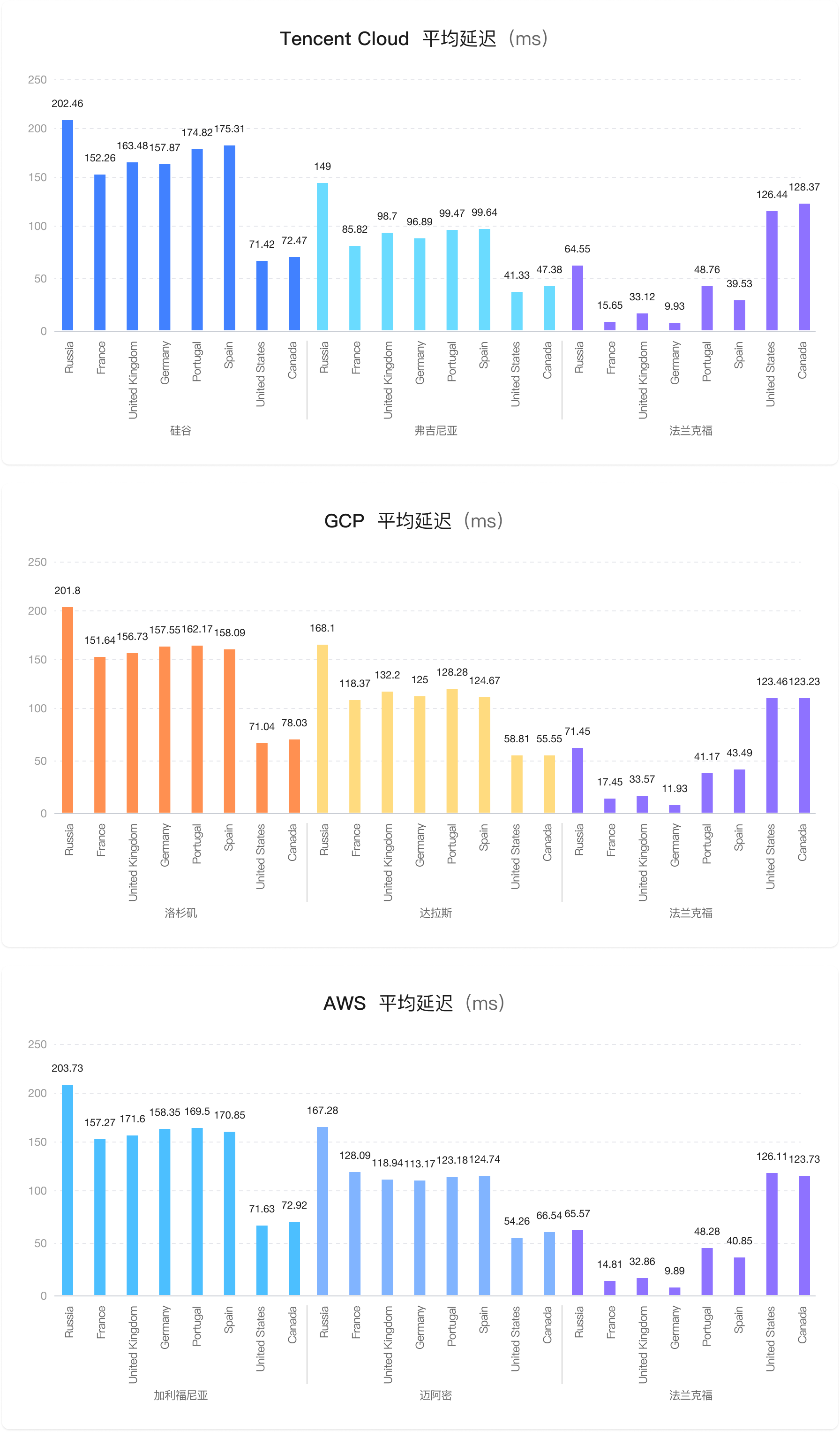 - Using the Frankfurt node to cover North America, Tencent Cloud has an average latency of 127ms, GCP has an average latency of 123ms, and AWS has an average latency of 125ms;