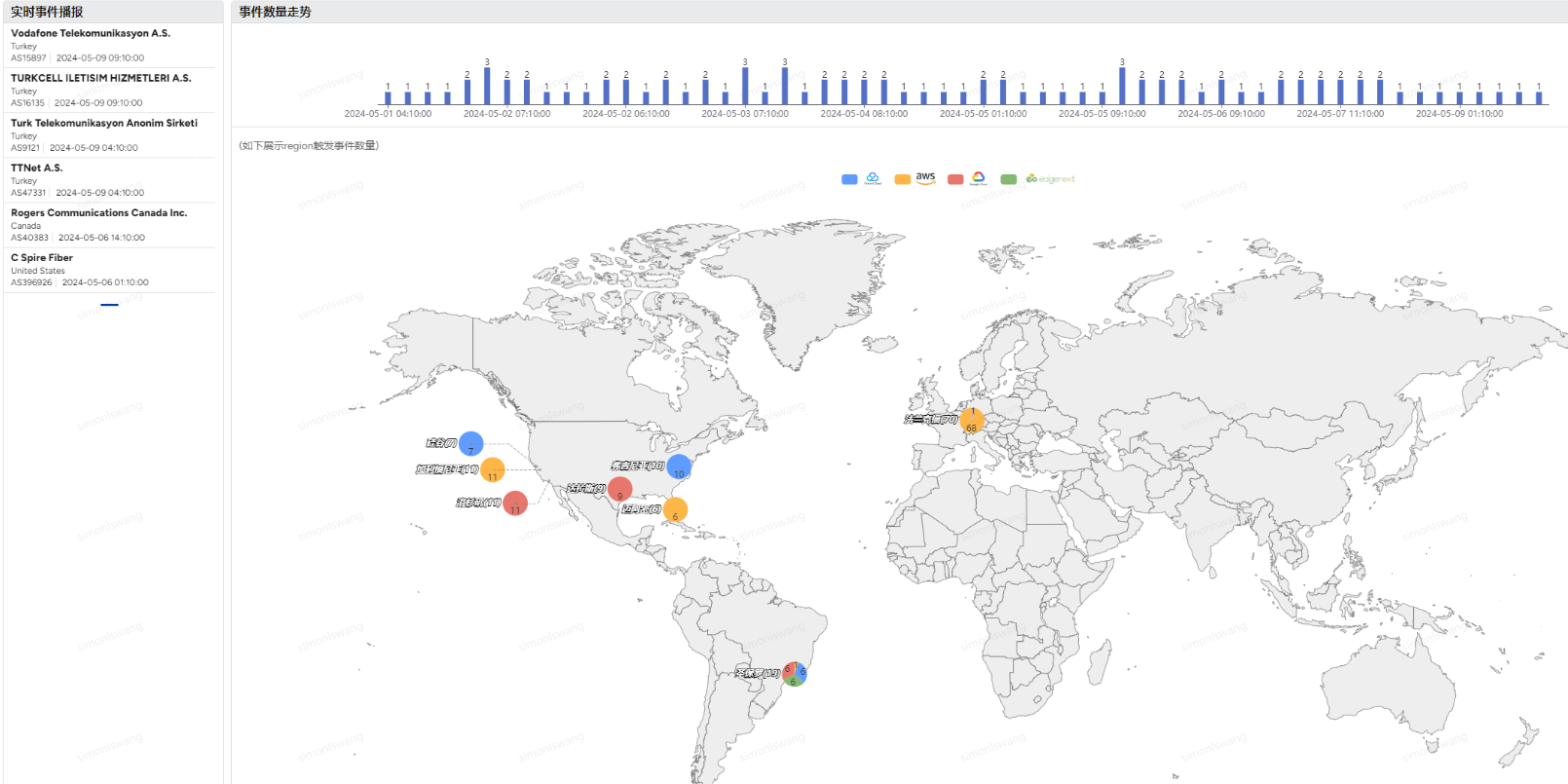 Visualize the number of network events occurring in different cloud regions probing mainstream carrier ASN IPs.