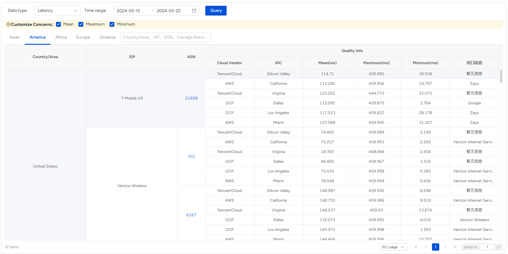 Mainstream carrier ASN information list, intuitive display of the three major network performance indicators.