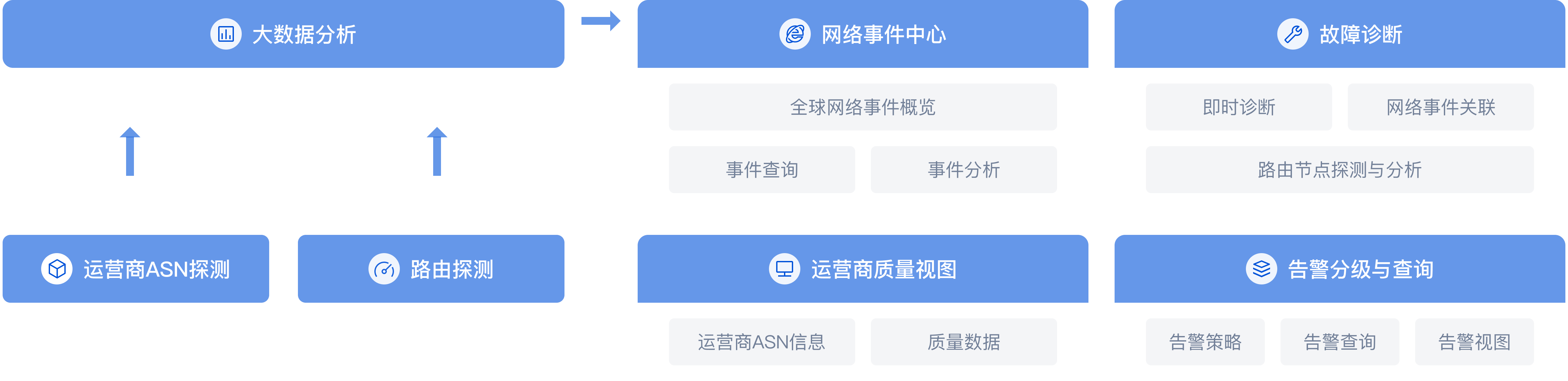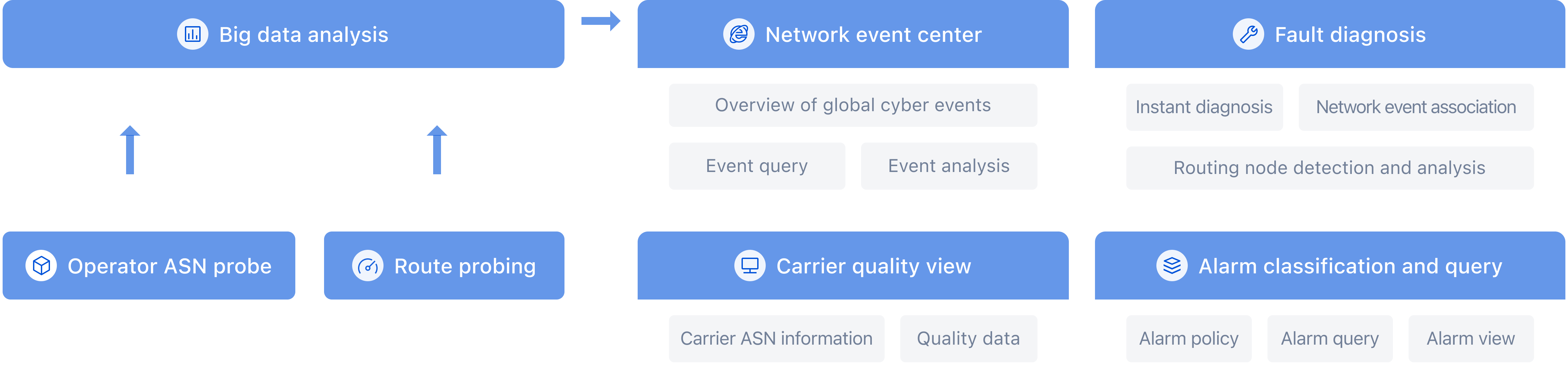 Network Troubleshooting monitors ASNs of mainstream carriers around the world, discovers network events in service distribution areas, and provides diagnostic tools for network link analysis to improve the efficiency of service network troubleshooting.