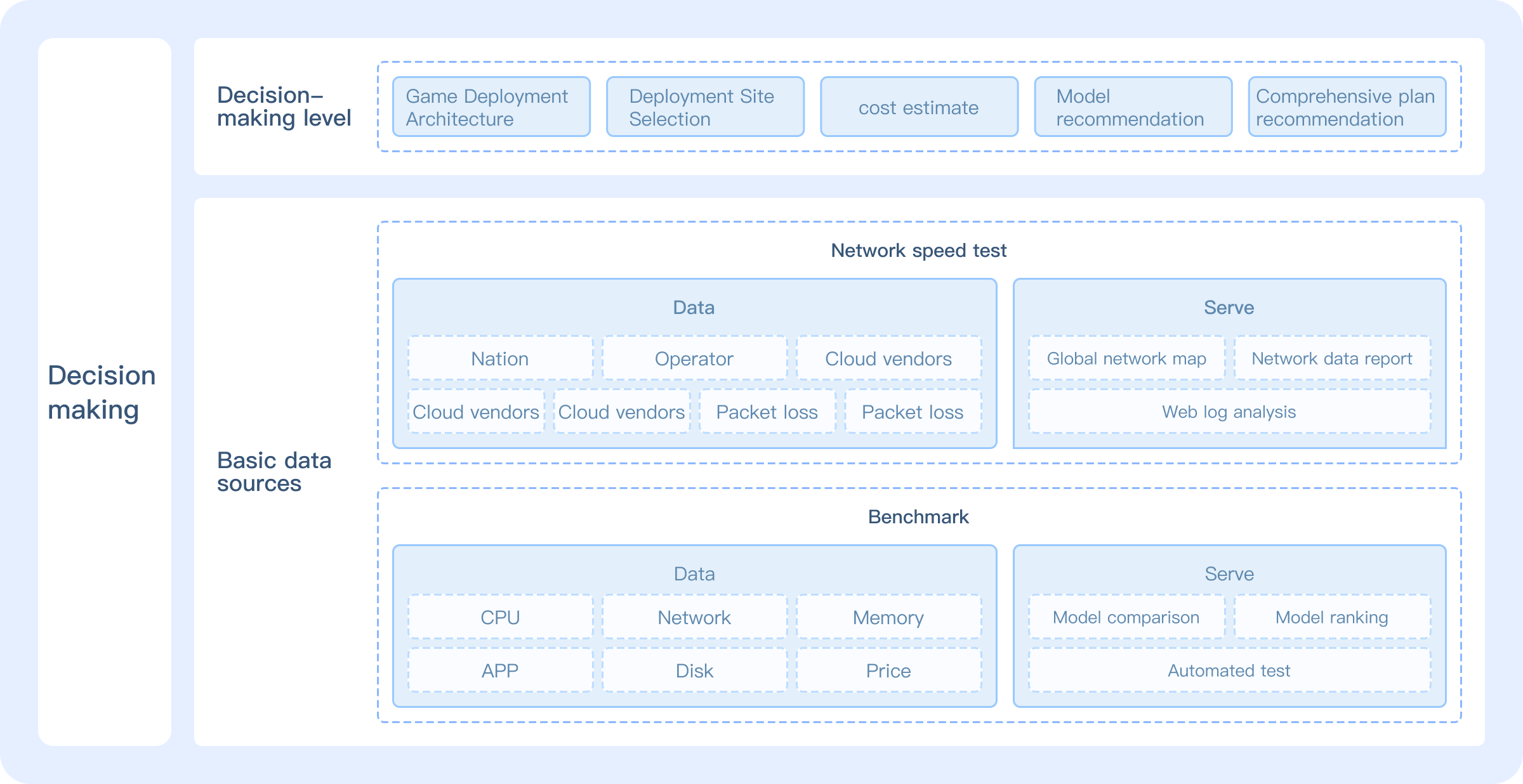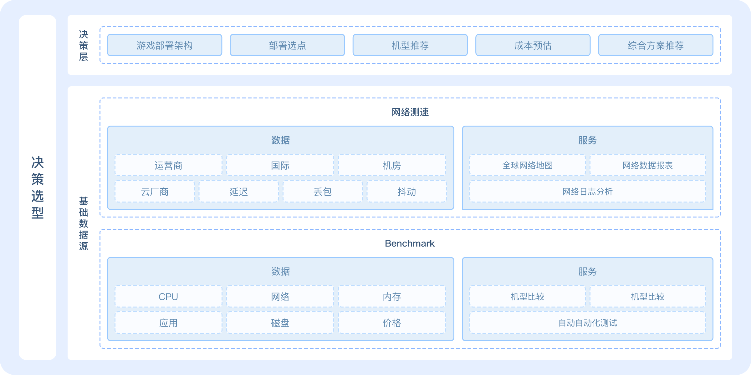 Faced with different games and different business scenarios, the feasibility of the business deployment architecture needs to be combined with the actual situation. Use Benchmark's decision selection tool to select different types of deployment architectures to provide users with data support for each architecture type.