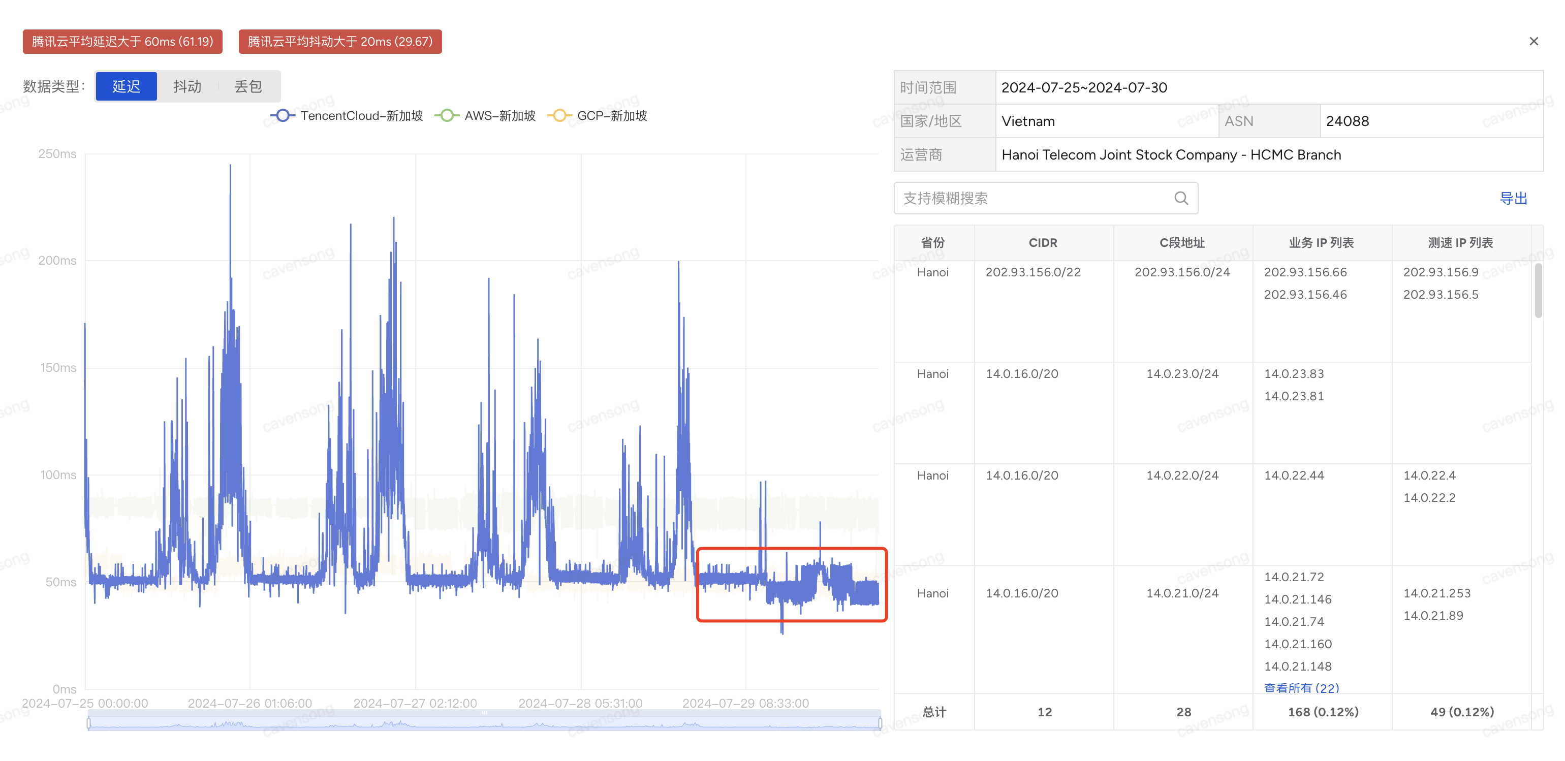 In response to the problems exposed in the network monitoring, the platform provides monitoring data, combined with detailed attribution content given by fault localization, and carries out network tuning with major cloud factories and carriers to protect the network experience of business users.
